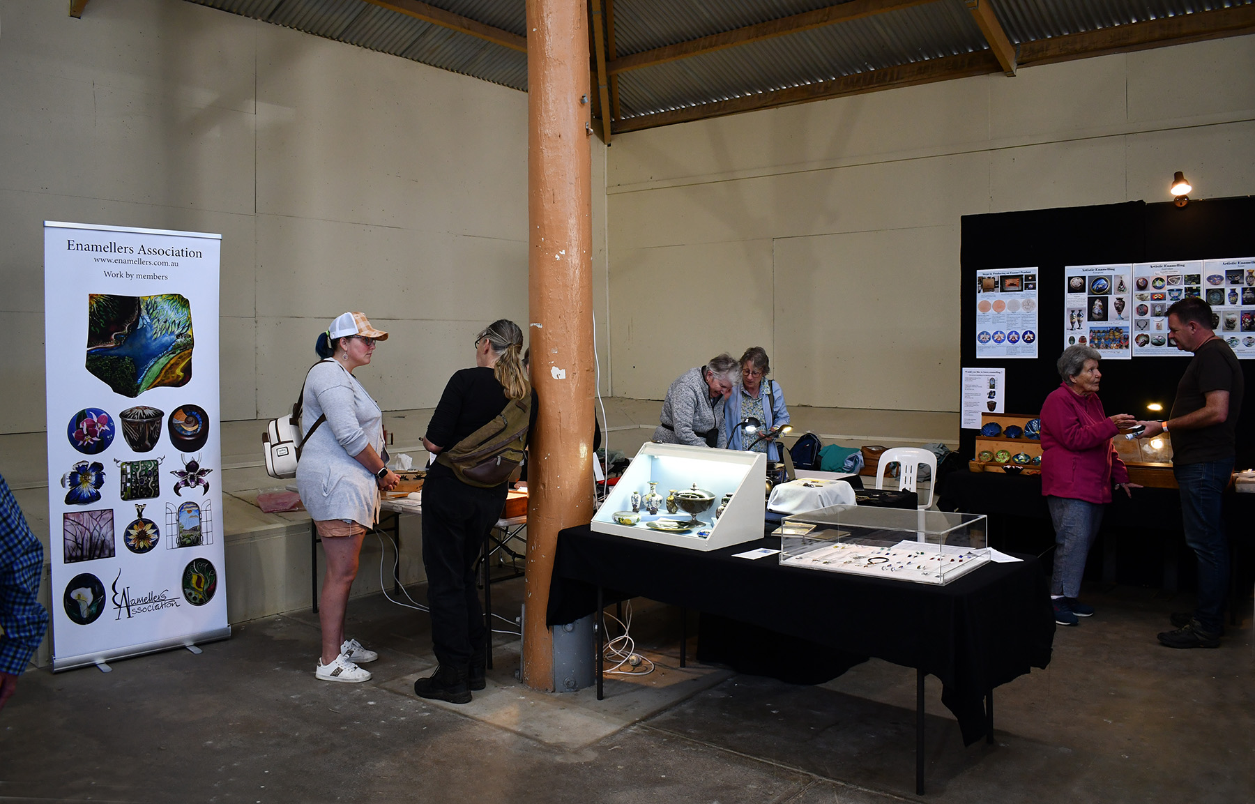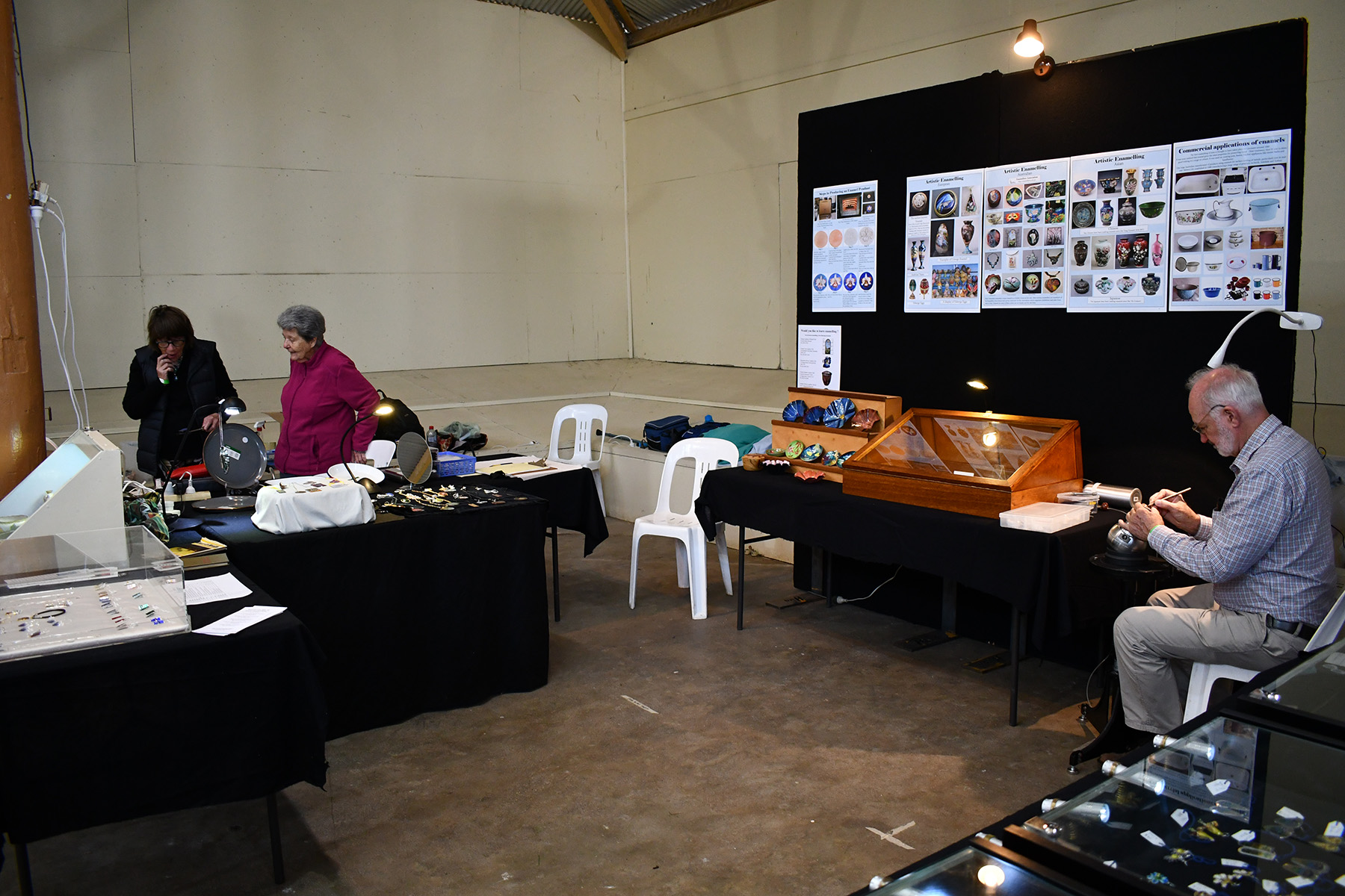 This is the second year that the Enamellers Association has participated in the Bathurst Heritage Trades Trail. This is a large fair that promotes old arts and crafts. It is held over a weekend in April at the Showground. This year over 3,000 people attended and the Association’s stall created a great deal of interest. Our attending members demonstrated many of the skills involved in enamelling and related activities. Our members saw many different traditional crafts expertly executed.