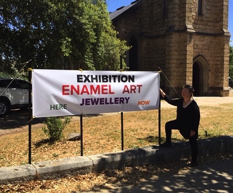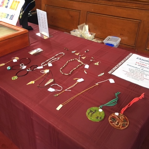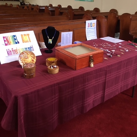 4 tables were set up in the historic Christ Church. The priest encourages all art forms to be displayed, or if musical, performed, in the church. One table had examples of traditional enamelling you would purchase when travelling. One table had many of the tools and examples of enamel powder; so that the techniques involved could be explained to visitors.